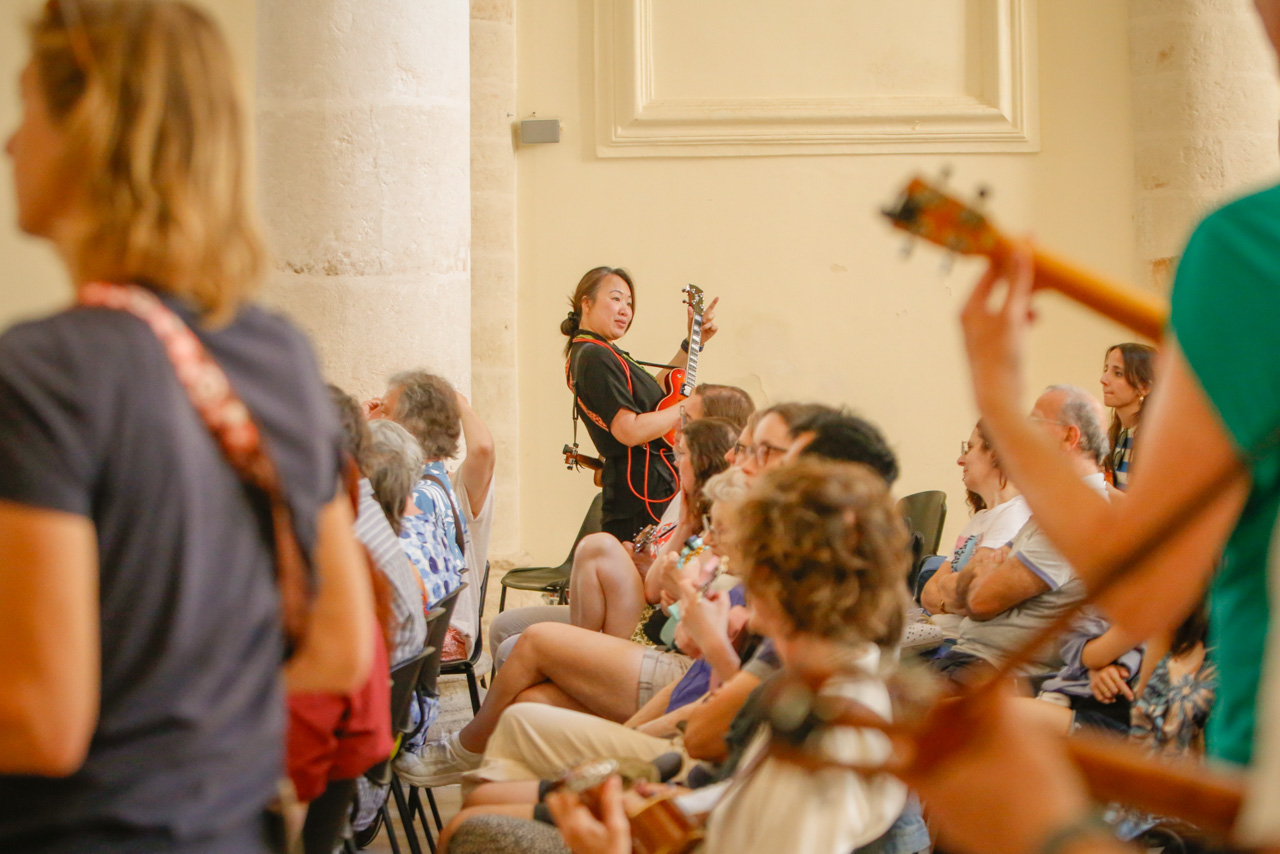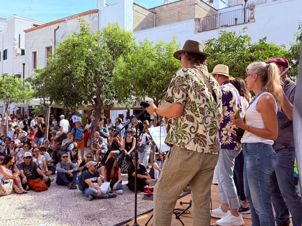Saturday’s concert at Piazza Palmieri is the beating heart of the festival — and when the last note fades, nobody is ready to stop. The crowd moves together to Caffè Mezzopieno, under the stars, and the music picks up right where it left off. This is the jam that tends to go the longest, the one where musicians from every corner of the world find each other and play as if they’ve always known one another. No set list, no rehearsal, no minimum level required — just your ukulele, the warmth of a Puglia Saturday night, and the feeling that the festival is at its fullest. If you’d like to bring your own songs and lead part of the session yourself, head to the Lead the Jam page to apply.