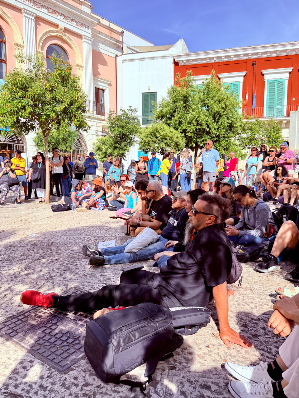 As Monopolele draws to a close, join us for the final street performance in front of Monopoli’s historic castle. This closing act brings together artists for impromptu performances, celebrating the festival’s spirit of spontaneity and camaraderie. It’s a last chance to experience the magic of street music before the grand finale concert and the right moment to learn more about italian “aperitivo”. Interested in taking part? Find participation details on our Play at the Fest page.